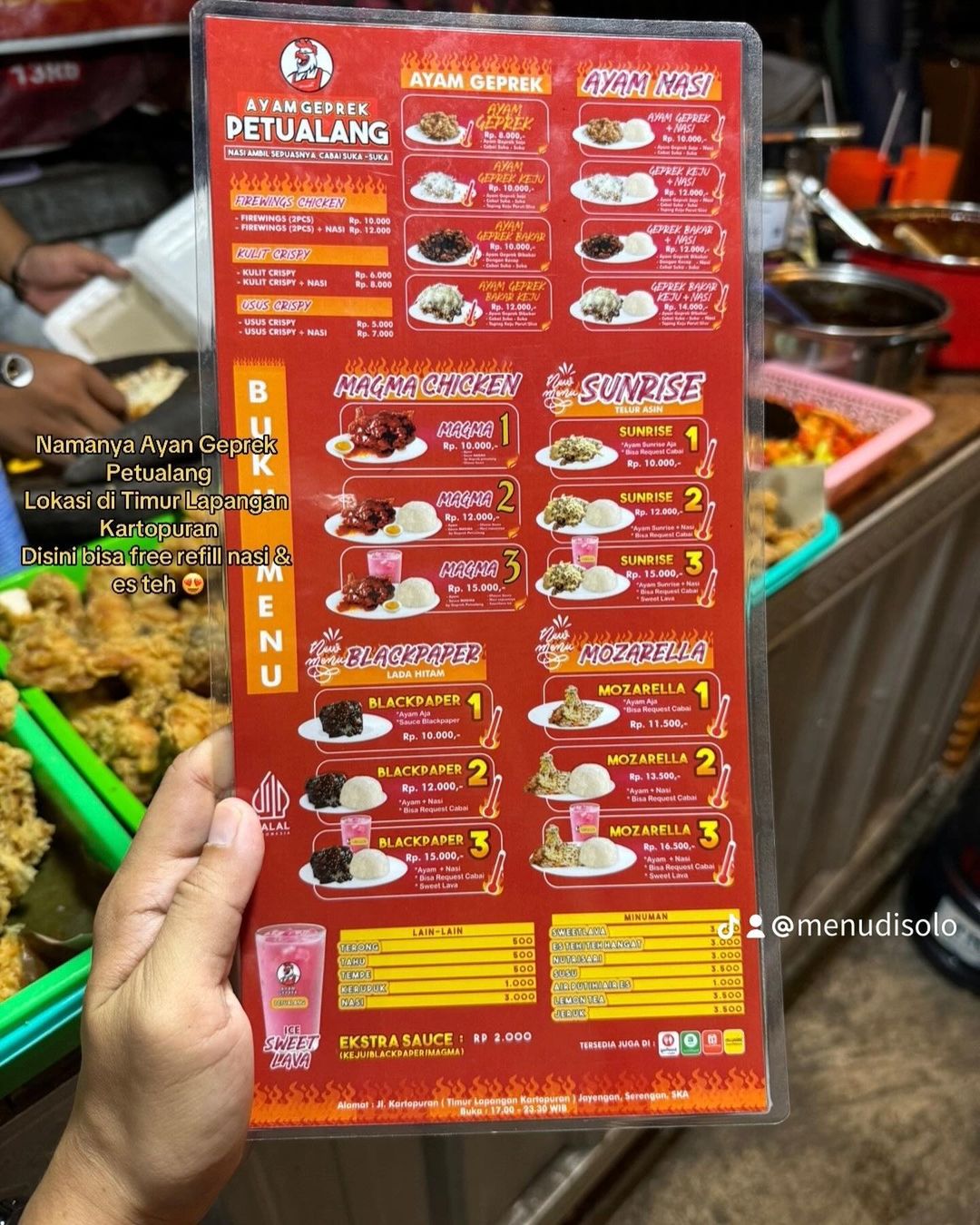 SoloInfo.id – Laper ? Makan kenyang di Solo yuk. Berburu kuliner enak di Solo dan sekitar. Kamu penggemar kuliner murah enak di Solo? Kamu harus simak info kuliner solo ini..Ada update solo info hari ini, kamu harus tau, Daftar Harga Menu Ayam Geprek Petualang di Solo…