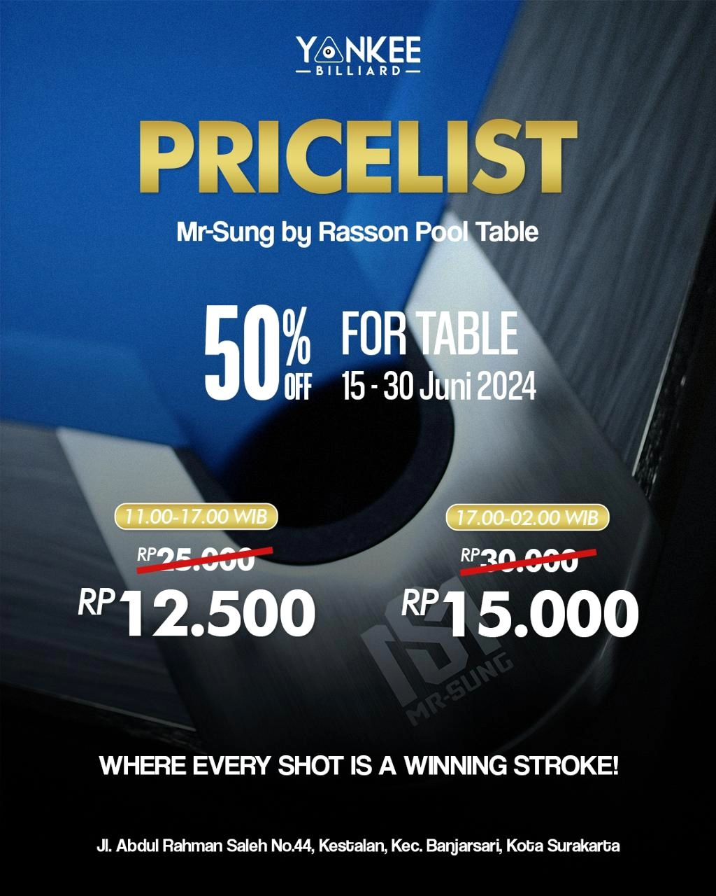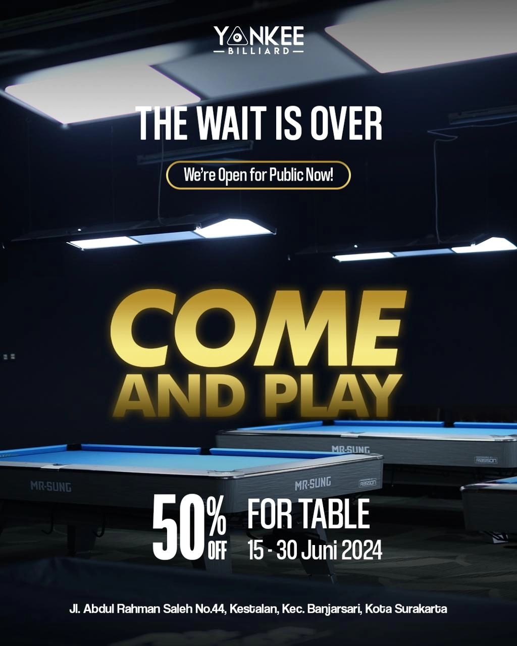 Catat tanggalnya ❕ 15 – 30 Juni akan ada Special Price dalam rangka Grand Opening @yankeebilliard. Pastikan kamu bersama teman-teman bisa ikut merayakan bersama kami dan dapatkan Special Price 50% Off selama periode tersebut????❤️