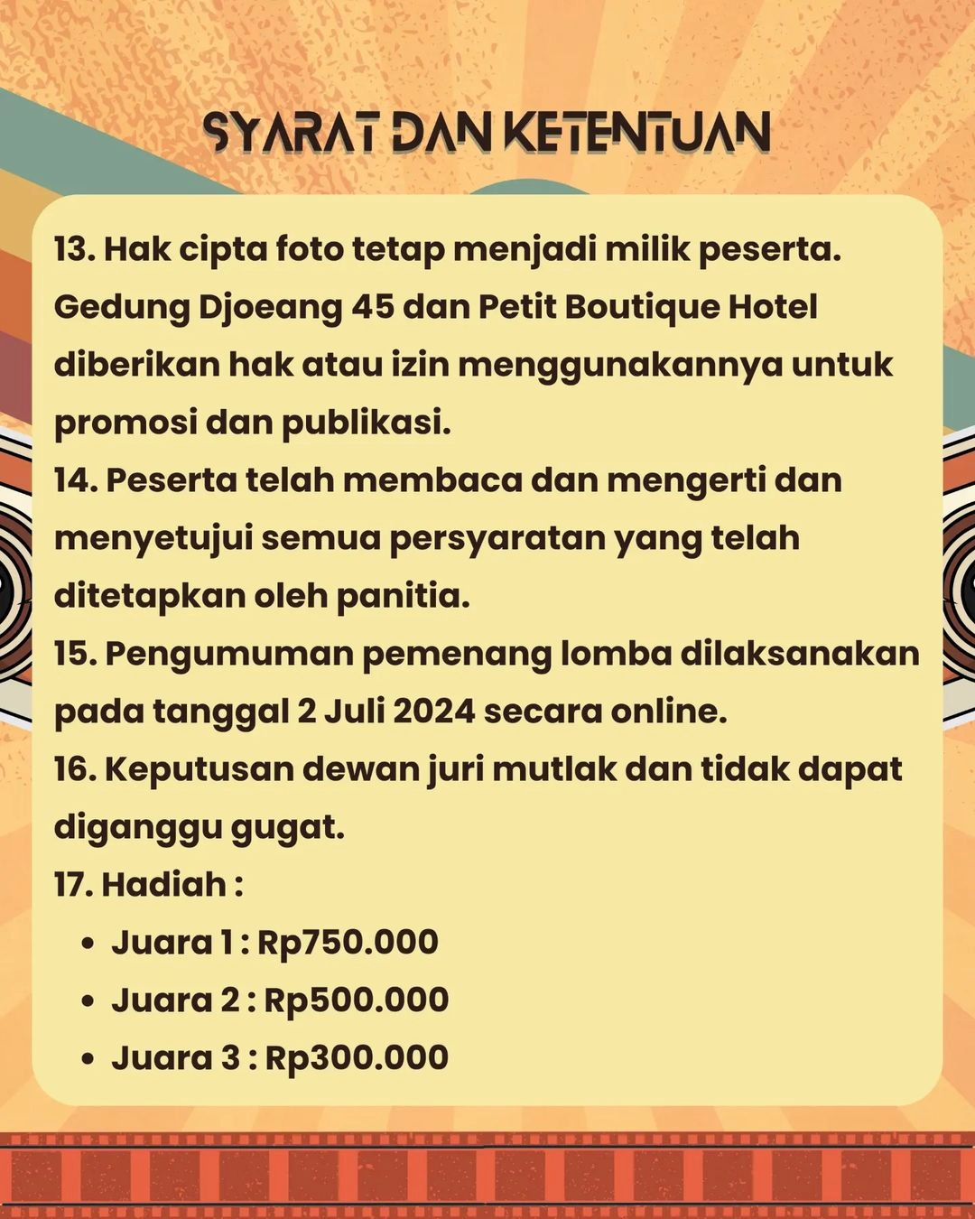 Kompetisi ini dilakukan secara ON THE SPOT, bersifat INDIVIDU/PERORANGAN dan terbuka untuk UMUM