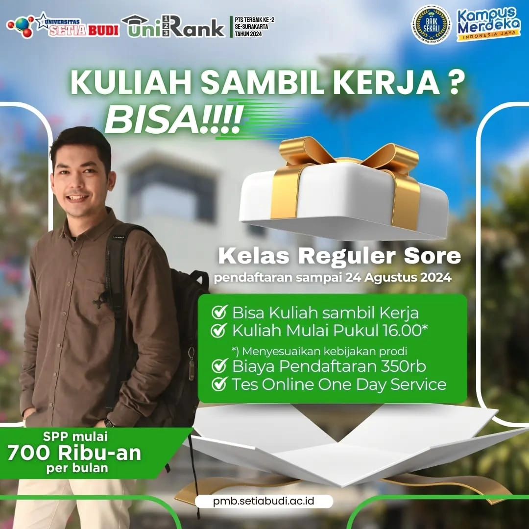 Sudah cek info Kuliah Sambil Kerja Kelas Reguler Sore di Universitas Setia Budi. Cari info tren di Solo. Cari info Solo terbaru? Cek update Solo Info. Cek sekarang juga….